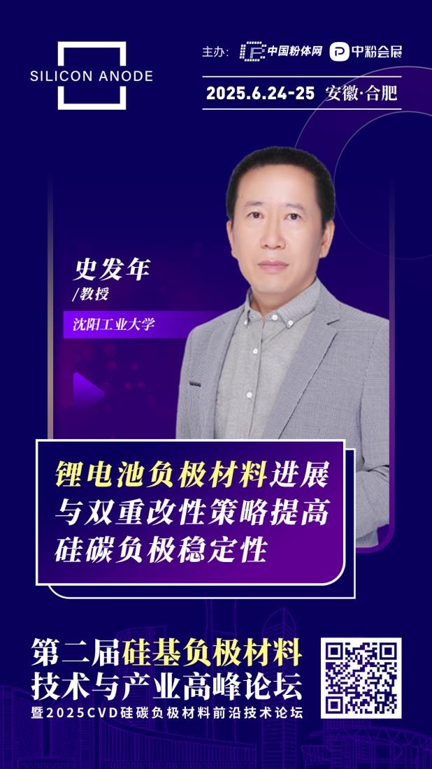 針對各類負極材料的產業化技術與國內外市場狀況,中國粉體網將于2025年6月24-25日在安徽·合肥舉辦第二屆硅基負極材料技術與產業高峰論壇暨2025CVD硅碳負極材料前沿技術論壇。大會旨在為負極材料產業鏈上中下游企業搭建深度交流的平臺,開展產、學、研合作,助推負極材料行業持續健康發展。屆時,來自沈陽工業大學的史發年教授將作題為《鋰電池負極材料進展與雙重改性策略提高硅碳負極穩定性》的報告。