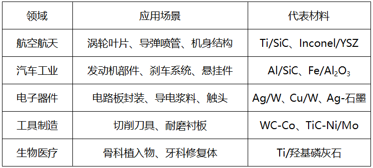 金屬陶瓷復(fù)合材料的組成結(jié)構(gòu)包括金屬相和陶瓷相,金屬相通常為過渡金屬(如鐵、鈷、鎳、銅、鈦及其合金),提供韌性和塑性。陶瓷相包括氧化物(Al2O3、ZrO2)、碳化物(SiC、TiC、WC)、氮化物(Si3N4、BN)或硼化物(TiB2、ZrB2),賦予高硬度和耐極端環(huán)境能力。在界面設(shè)計(jì)上,通過優(yōu)化潤濕性、熱膨脹匹配和化學(xué)相容性,確保兩相結(jié)合強(qiáng)度。