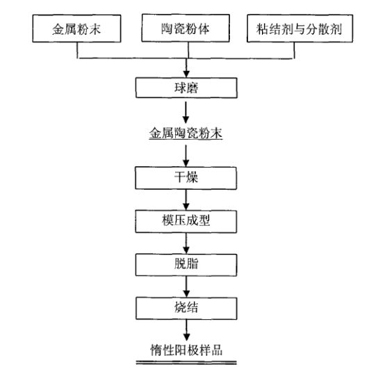 NiFe2O4基金屬陶瓷在金屬陶瓷陽極材料中占主導(dǎo)地位,因?yàn)樘沾上?/span>NiFe2O4在冰晶石氧化鋁熔體中具有良好的化學(xué)穩(wěn)定性,目前以金屬相、質(zhì)量分?jǐn)?shù)在20%以內(nèi)的NiFe2O4基金屬陶瓷研究的最多。NiFe2O4基金屬陶瓷制備以粉末冶金為核心,流程涵蓋配比設(shè)計(jì)→混合→成型→脫脂→燒結(jié)→后處理。