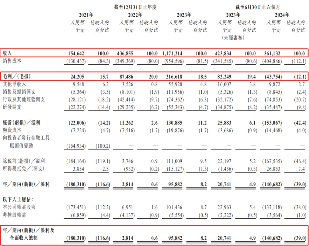 在營收方面,2021-2023年營收從1.55億元躍升至11.71億元,年復合增長率175.2%;但2024年上半年營收3.61億元,同比下降14.9%。對于2024年業(yè)績上的下滑,招股書中的理由是海外銷量的減少以及受到了國際貿(mào)易政策的影響。