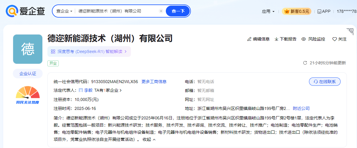 中國粉體網訊 6月16日,阜新德爾汽車部件股份有限公司(簡稱:德爾股份)在浙江湖州設立的全資子公司——德邇新能源技術(湖州)有限公司已完成工商注冊并正式成立。