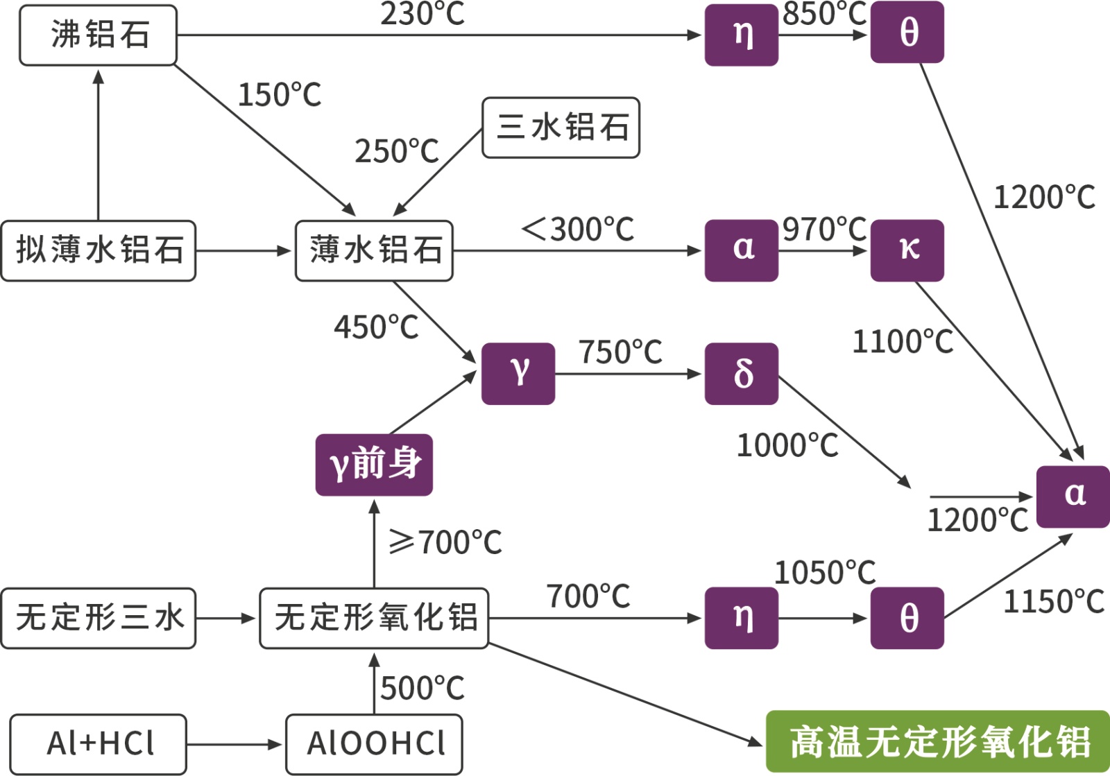 水合氧化鋁也稱為無水氧化鋁的前驅體,變體種類是由不同制備條件及原料等因素決定的,而無水氧化鋁的變體種類則是由前驅體的不同煅燒溫度決定的,當煅燒溫度大于1200℃時會生成最穩定的α-Al2O3,而其余無水氧化鋁的變體晶型都屬于不穩定的氧化鋁,又稱氧化鋁的過渡態。下面是在不同溫度條件下水合氧化鋁和無水氧化鋁晶型轉變的示意圖。