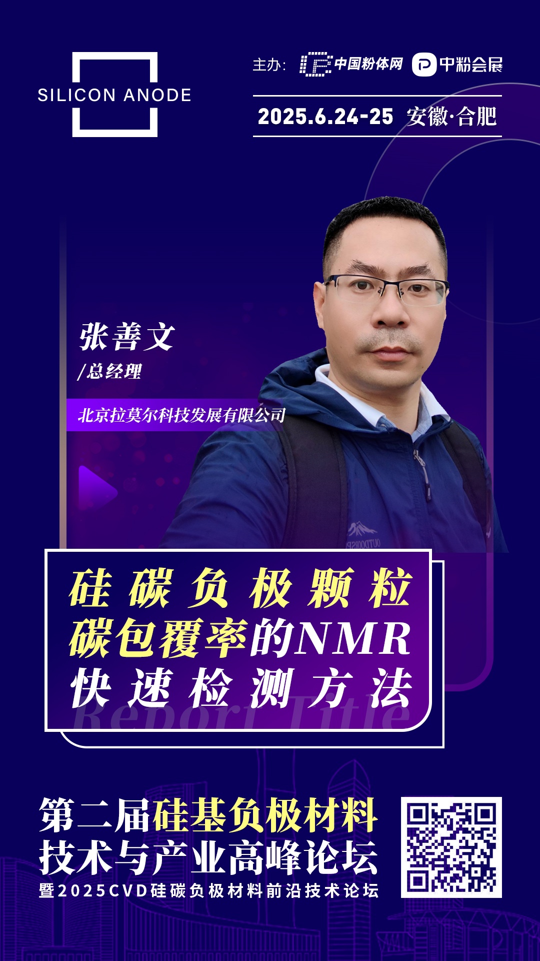 針對各類負極材料的產業化技術與國內外市場狀況,中國粉體網將于2025年6月24-25日在安徽·合肥舉辦第二屆硅基負極材料技術與產業高峰論壇暨2025CVD硅碳負極材料前沿技術論壇。旨在為負極材料產業鏈上中下游企業搭建深度交流的平臺,開展產、學、研合作,助推負極材料行業持續健康發展。屆時,北京拉莫爾科技發展有限公司總經理張善文將作題為《硅碳負極顆粒碳包覆率的NMR快速檢測方法》的報告。