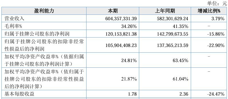 龍鑫智能2024年度,營收6.04億元,比上年同期增長3.79%;歸屬于掛牌公司股東的凈利潤1.20億元,比上年同期減少15.86%。
