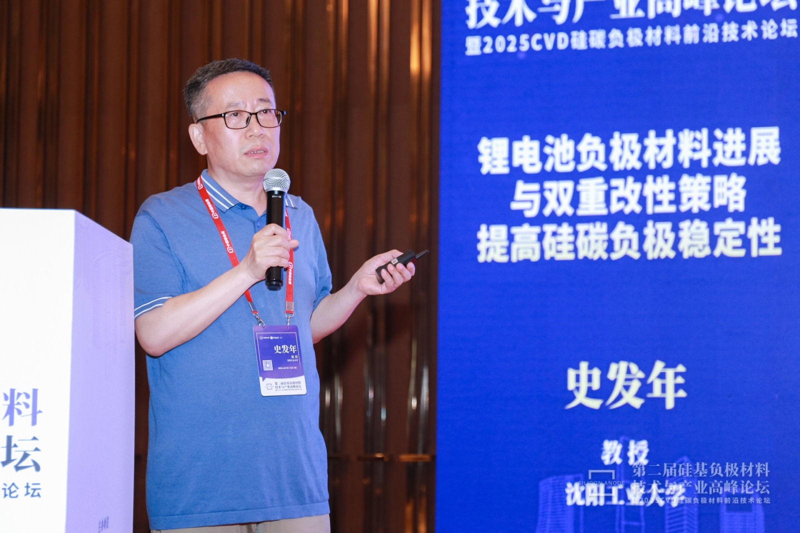 沈陽(yáng)工業(yè)大學(xué)史發(fā)年教授作《鋰電池負(fù)極材料進(jìn)展與雙重改性策略提高硅碳負(fù)極穩(wěn)定性》報(bào)告