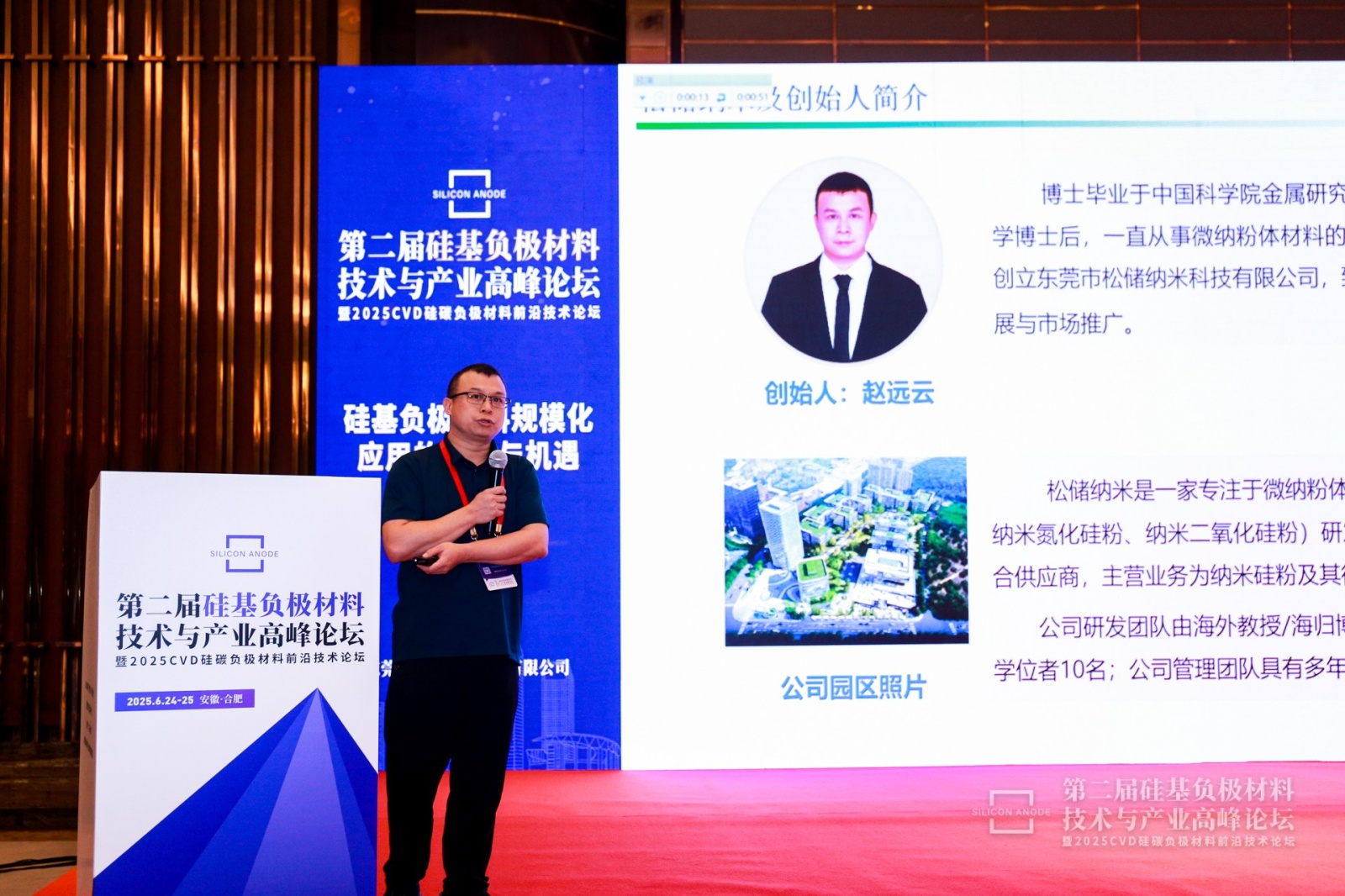 東莞市松儲(chǔ)納米科技有限公司總經(jīng)理趙遠(yuǎn)云博士作《硅基負(fù)極材料規(guī)模化應(yīng)用的挑戰(zhàn)與機(jī)遇》報(bào)告