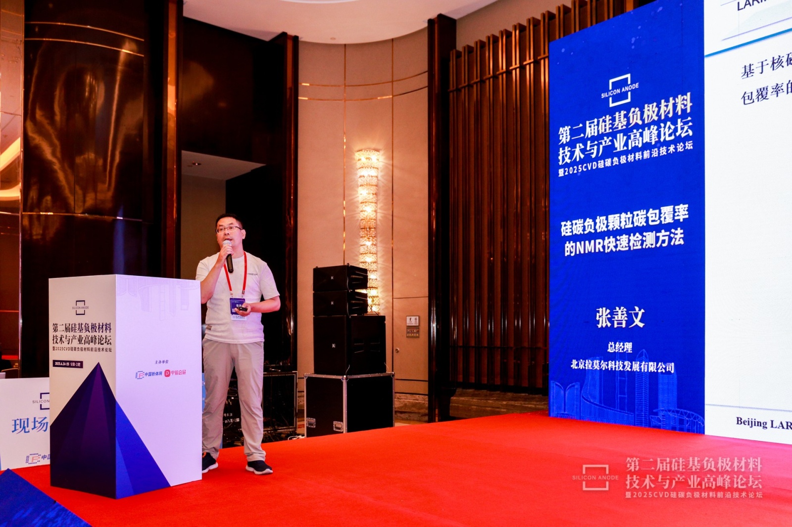 北京拉莫爾科技發(fā)展有限公司總經(jīng)理張善文作《硅碳負(fù)極顆粒碳包覆率的NMR快速檢測(cè)方法》的報(bào)告