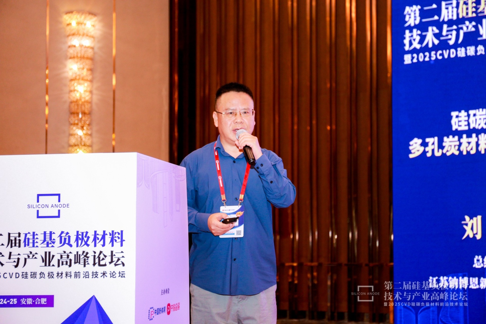 江蘇鈉博恩新材料有限公司總經(jīng)理劉燦作《硅碳負(fù)極多孔炭材料的產(chǎn)業(yè)化》報(bào)告