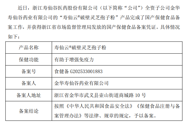 中國粉體網訊 近日,浙江壽仙谷醫藥股份有限公司全資子公司金華壽仙谷藥業有限公司的“壽仙云”破壁靈芝孢子粉”產品完成了國產保健食品備案工作,并獲得浙江省市場監督管理局發放的國產保健食品備案憑證。產品備案成功有利于進一步補充完善公司的產品品類,豐富公司的產品線。