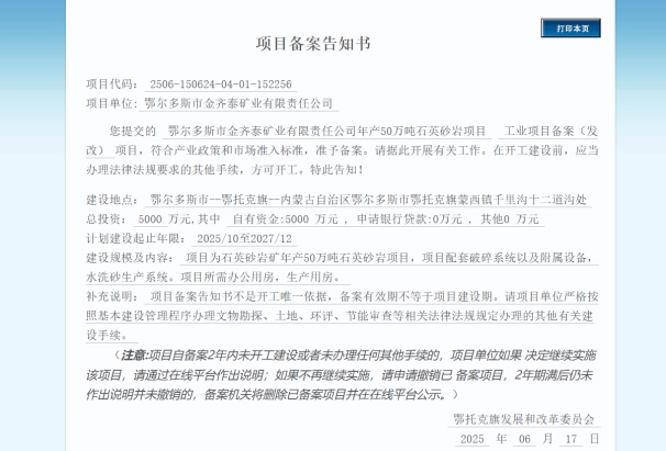 內(nèi)蒙古投資項目在線審批辦事大廳發(fā)布了鄂爾多斯市金齊泰礦業(yè)有限責任公司年產(chǎn)50萬噸石英砂巖項目和赤峰盛源石英石粉加工有限公司年加工酸洗提純15萬噸石英砂擴建項目備案公示。
