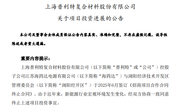 中國粉體網訊 7月1日,上海普利特復合材料股份有限公司(以下簡稱“普利特”或“公司”)發布公告,控股子公司江蘇海四達電源有限公司(以下簡稱“海四達”)與瀏陽經濟技術開發區管理委員會(以下簡稱“瀏陽經開區”)于2025年6月簽訂《招商項目合作合同終止合同》。
