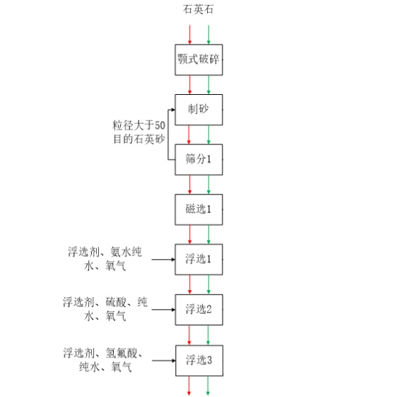 主要生產工藝有破碎、制砂、篩分、磁選、浮選、酸洗、水洗、脫水、干燥、氯化焙燒、包裝等,99.999%高純石英砂與99.998%高純石英生產工藝區別體現在99.999%高純石英砂為了提高純度需進行二次酸洗及氯化提純。