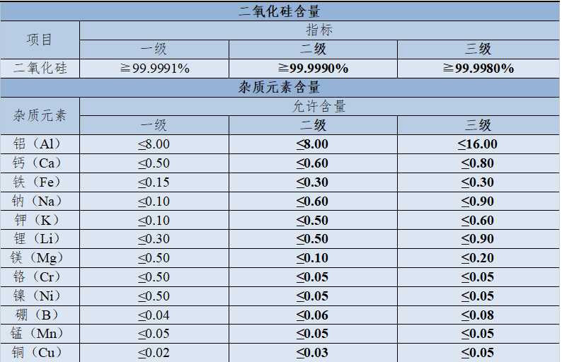電子產品用高純石英砂產品質量標準(單位:ppm)