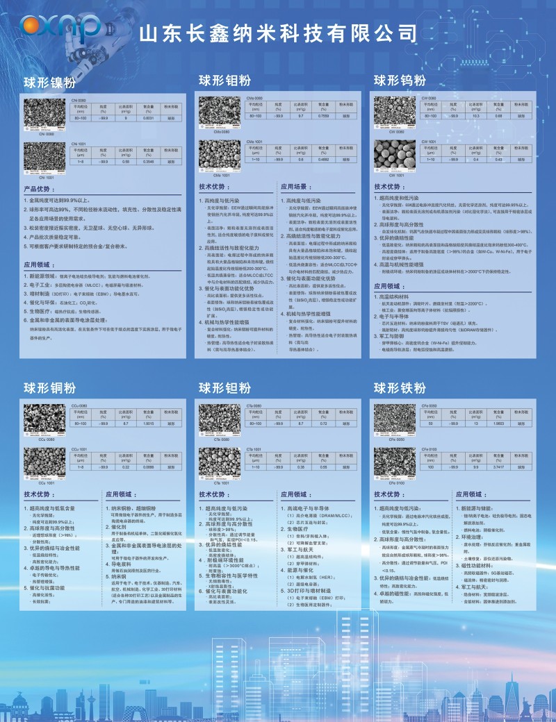 山東長鑫納米科技有限公司是一家集高端納米金屬粉體材料研發、生產、銷售為一體的企業。公司配備出色的研發和服務團隊,聚焦高熔點高球形度金屬納米粉末細分專業市場。