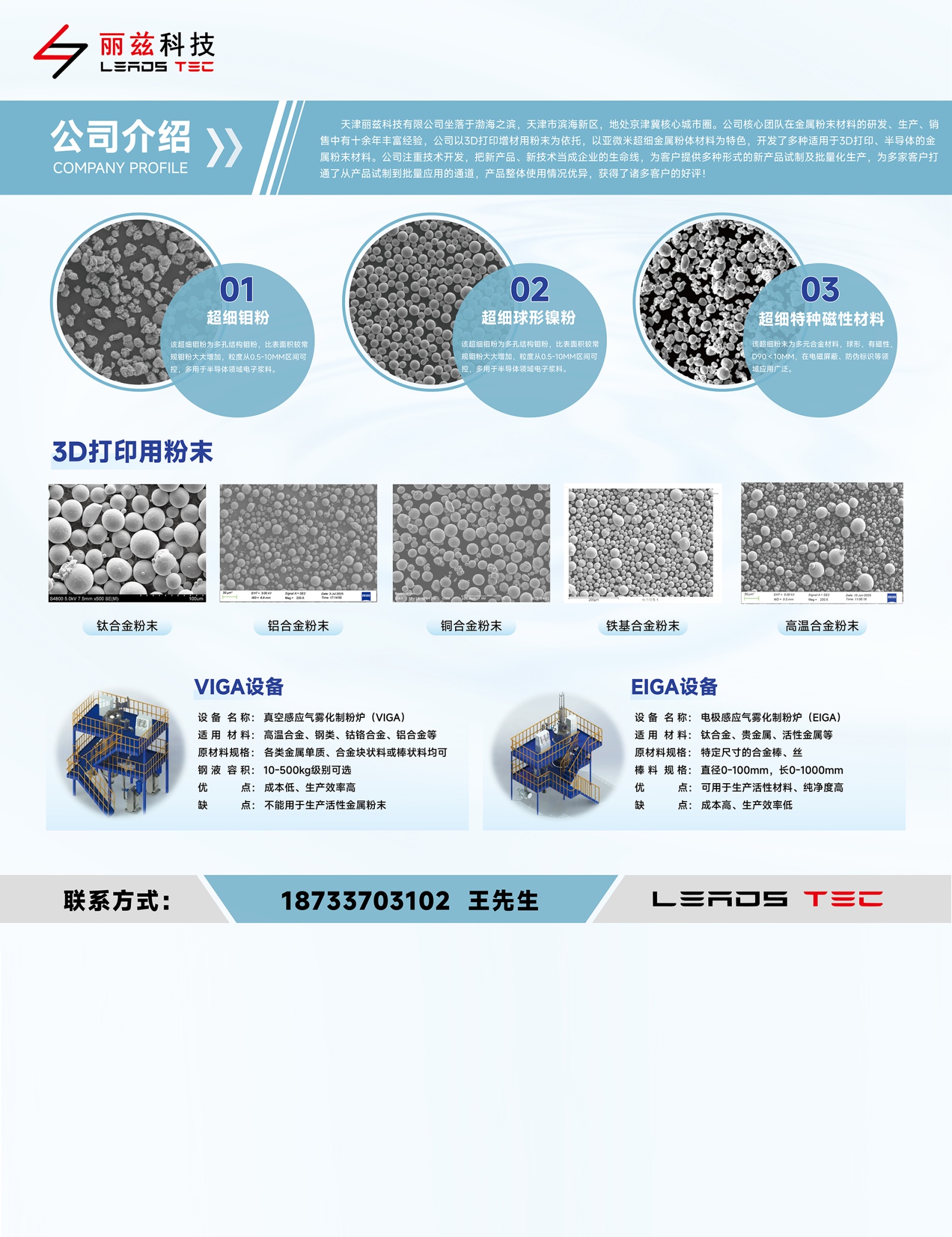 麗茲科技應用多種生產技術生產金屬粉末材料,包括氣體霧化、等離子球化等技術,提供的金屬粉末球形度高,流動性好,與不同品牌金屬打印機兼容性好;生產目前以天津工廠為基地,利用當地資源優(yōu)勢推動金屬材料的研發(fā)和應用。