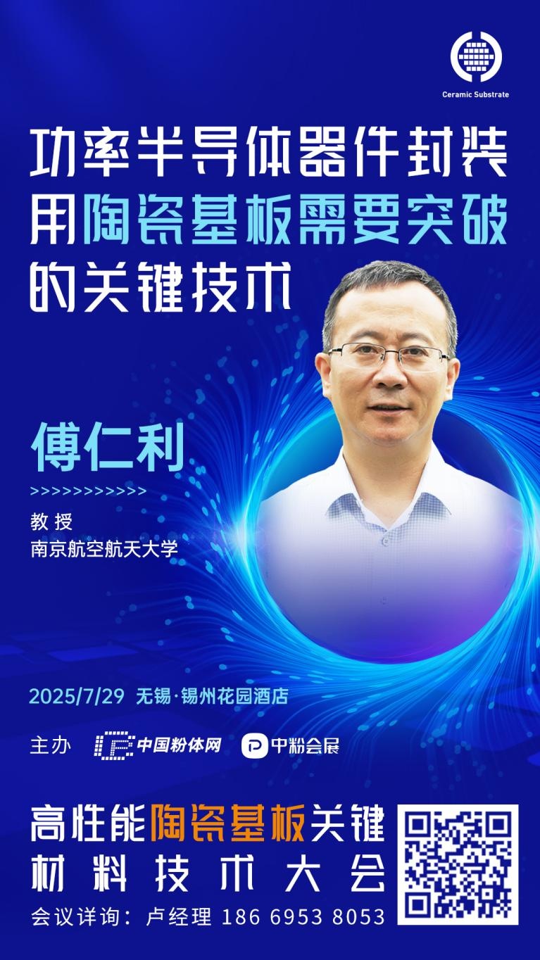 半導體及電子信息產業的快速發展對核心材料的性能提出了更高要求。陶瓷基板作為功率半導體器件的關鍵封裝材料,其導熱性能、機械強度、可靠性和精密程度直接決定了終端產品的性能與壽命。針對材料研發、制備工藝、檢測技術、應用場景等核心議題,中國粉體網將于2025年7月29日在江蘇無錫舉辦2025高性能陶瓷基板關鍵材料技術大會。屆時,南京航空航天大學教授傅仁利將作題為《功率半導體器件封裝用陶瓷基板需要突破的關鍵技術》的報告。