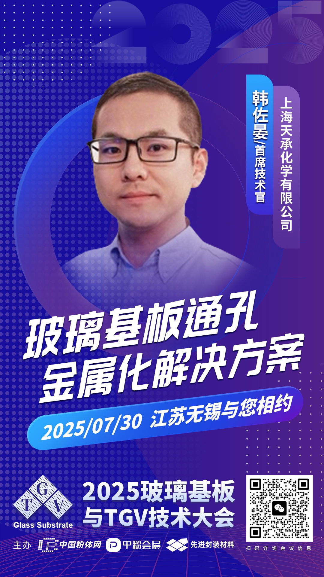為強化行業信息交流,中國粉體網將于2025年7月30日在無錫舉辦2025玻璃基板與TGV技術大會。屆時,上海天承化學有限公司首席技術官韓佐晏將作題為《玻璃基板通孔金屬化解決方案》的報告,分享其關于TGV金屬化的關鍵研究。