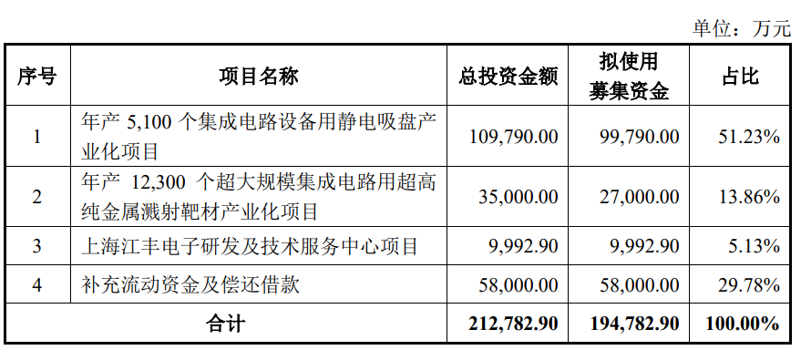 此次募資項目“年產5,100個集成電路設備用靜電吸盤產業化項目”目總投資額為109,790.00萬元,擬使用募集資金99,790.00萬元,旨在充分發揮公司半導體超高純金屬濺射靶材及精密零部件領域所積累的產研技術及客戶優勢,實現靜電吸盤產品的量產和銷售,以緩解我國高端靜電吸盤供求失衡的局面,助力我國半導體產業鏈的自主可控性。