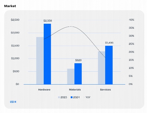 在全球金屬增材制造市場的強勁增長勢頭當中,據悉材料市場增速最快,受鈦合金等高價值金屬需求激增推動,同比增長35.6%。