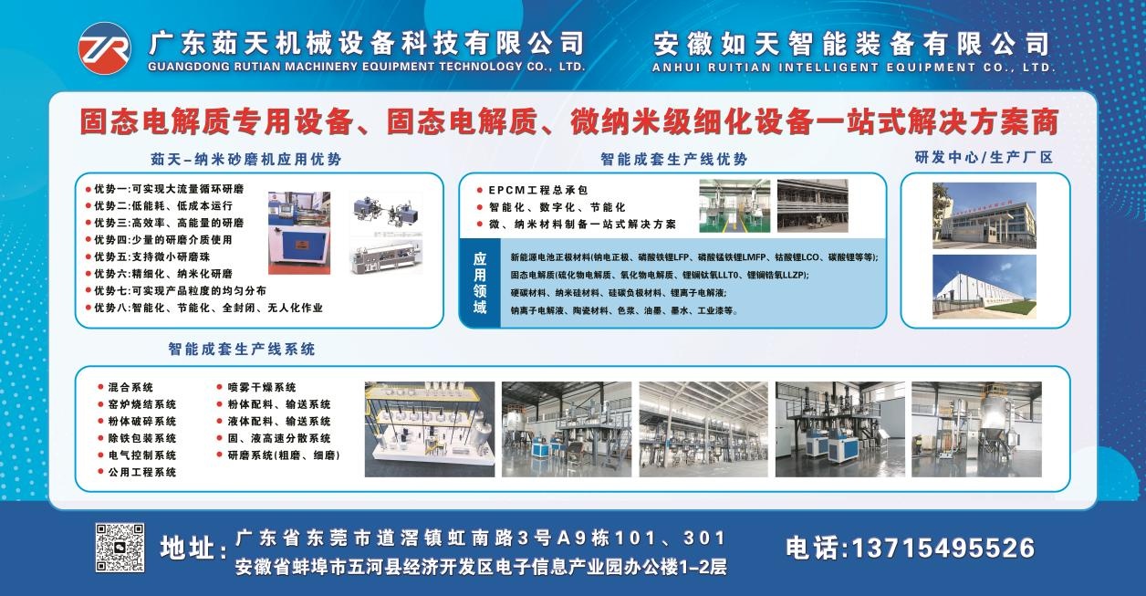 中國粉體網(wǎng)訊 廣東茹天機(jī)械設(shè)備科技有限公司(簡稱:茹天科技)圍繞固態(tài)電池和鈉電池,已展開相關(guān)布局,設(shè)有上海茹天銷售、研發(fā)總部中心,安徽如天大規(guī)模生產(chǎn)基地、研發(fā)中心,廣東茹天生產(chǎn)基地研發(fā)中心等。其中,規(guī)劃了50000平米的大規(guī)模生產(chǎn)基地、10000平米研發(fā)中心,研發(fā)固態(tài)電池和鈉電池的正負(fù)極材料裝備,電解質(zhì)智能成套裝備等,研發(fā)中心配套產(chǎn)業(yè)化開展技術(shù)研究開發(fā)和裝備技術(shù)開發(fā)等。