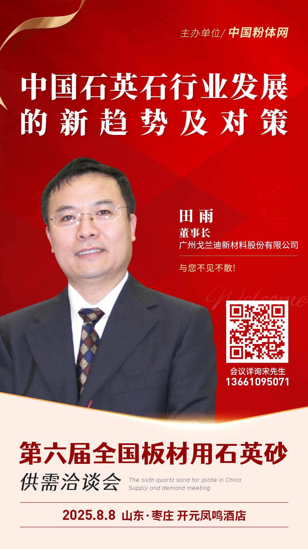 2025年8月8日,由中國粉體網主辦的第六屆全國板材用石英砂供需洽談會將在山東棗莊召開,廣州戈蘭迪新材料股份有限公司董事長田雨將作《中國石英石行業發展的新趨勢及對策》的報告,深度剖析行業當前面臨的痛點難點,精準研判未來技術突破的核心方向,為行業發展撥開迷霧。