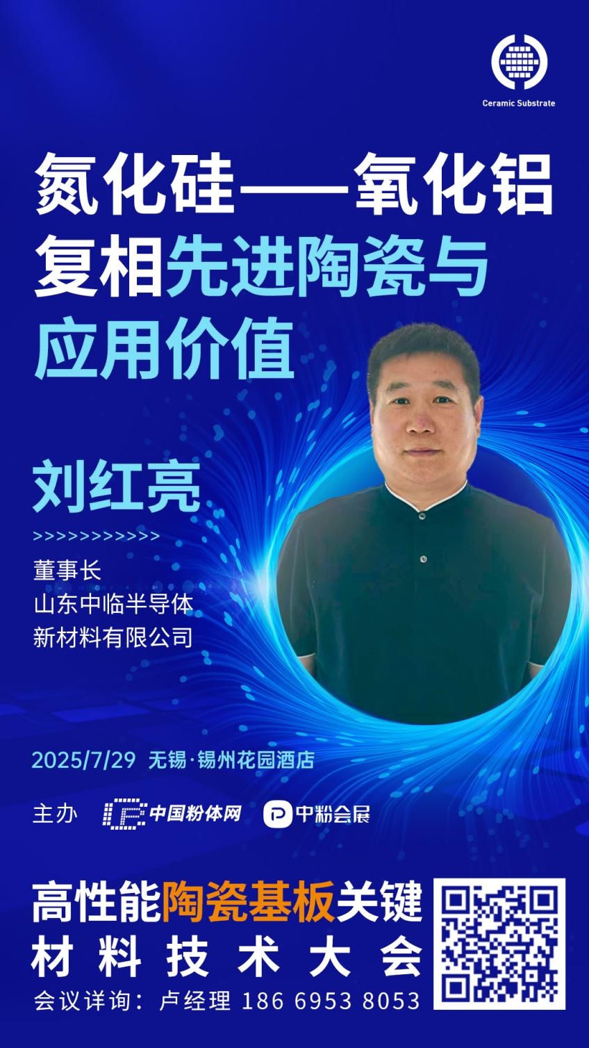 半導體及電子信息產業的快速發展對核心材料的性能提出了更高要求。陶瓷基板作為功率半導體器件的關鍵封裝材料,其導熱性能、機械強度、可靠性和精密程度直接決定了終端產品的性能與壽命。針對材料研發、制備工藝、檢測技術、應用場景等核心議題,中國粉體網將于2025年7月29日在江蘇無錫舉辦2025高性能陶瓷基板關鍵材料技術大會。屆時,山東中臨半導體新材料有限公司董事長劉紅亮將作題為《氮化硅——氧化鋁復相先進陶瓷與應用價值》的報告,報告將從以下幾個方面展開:①復相陶瓷技術特性②軍工領域應用分析③民用市場應用拓展④核心工藝與設備⑤市場前景與挑戰。