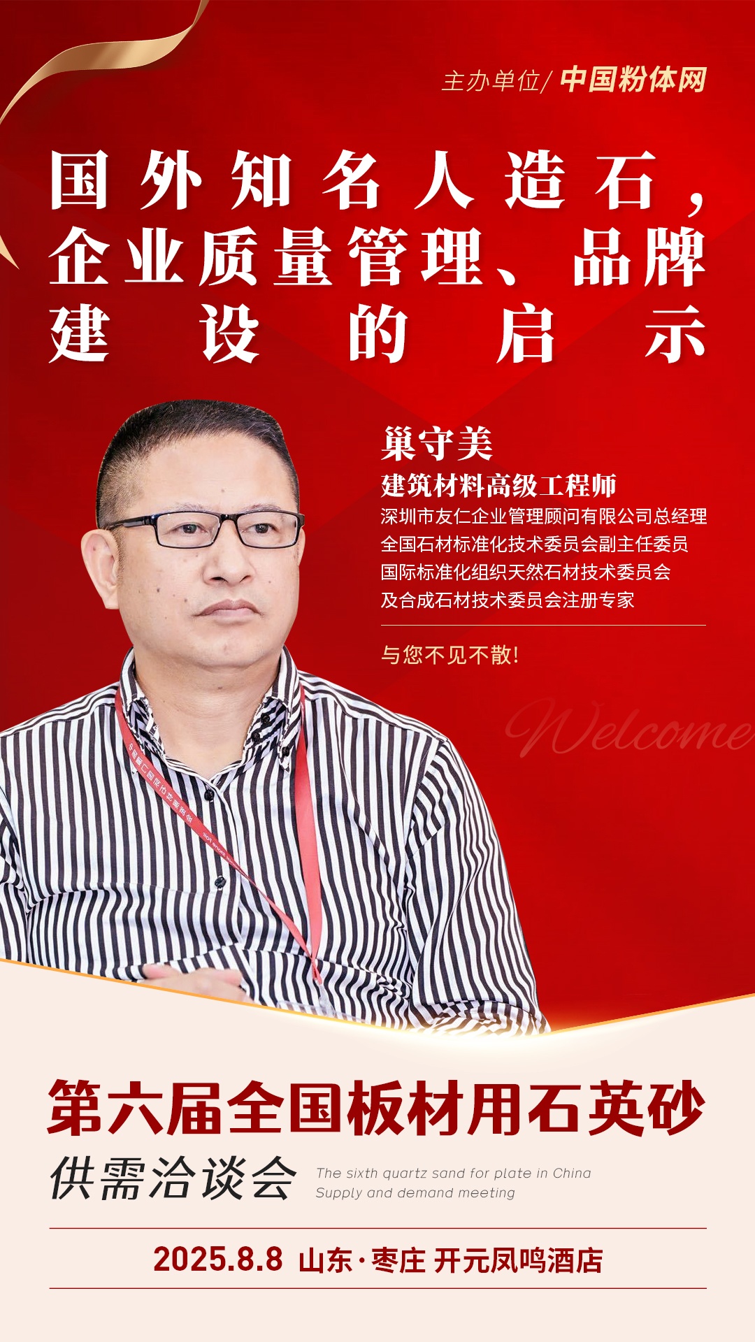 2025年8月8日,由中國粉體網主辦的第六屆全國板材用石英砂供需洽談會將在山東棗莊召開,建筑材料高級工程師巢守美將作《國外知名人造石,企業質量管理、品牌建設的啟示》的報告,從質量管理、品牌定位、全球化營銷等維度,為國內企業帶來實戰性借鑒。