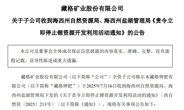 中國粉體網訊 7月17日午間,藏格礦業發布公告稱,其全資子公司格爾木藏格鉀肥有限公司于7月16日接收到海西州自然資源局及海西州鹽湖管理局聯合下發的監管通知。該通知明確要求企業立即終止違規的鋰資源開發利用行為。