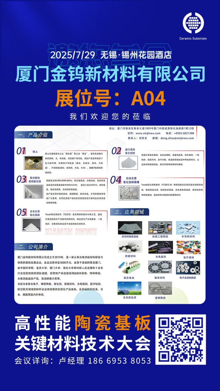 高性能陶瓷基板關鍵材料技術大會將于2025年7月29日在江蘇無錫舉辦。廈門金鎢新材料有限公司作為參展單位邀請您共同出席。