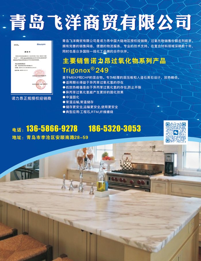 青島飛洋商貿有限公司主要經銷批發,不飽和樹脂、環氧樹脂、彩色膠衣、進口LR色漿、進口脫模蠟、進口脫模劑、模具硅膠、玻璃鋼原材料、玻璃纖維、諾力昂固化劑、短切氈、乙烯基樹脂、防腐樹脂、阻燃樹脂、耐高溫樹脂、模具樹脂、模具膠衣、石材樹脂、工藝品樹脂、模特樹脂等是青島飛洋商貿有限公司的主營產品。青島飛洋商貿有限公司是一家經國家相關部門批準注冊的企業。青島飛洋商貿有限公司以雄厚的實力、合理的價格、優良的服務與多家企業建立了長期的合作關系。青島飛洋商貿有限公司熱誠歡迎各界前來參觀、考察、洽談業務。