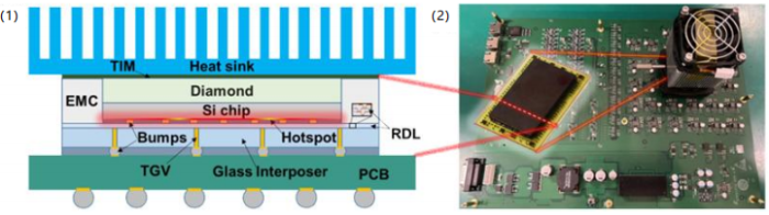 (1)集成金剛石-芯片-玻璃轉接板(DoCoG)的結構示意圖,(2)DoCoG封裝熱測試配置照片,圖源:Heterogeneous Integration of Diamond-on-Chip-on-Glass Interposer for Efficient Thermal Management