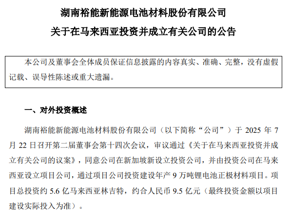 湖南裕能表示,公司本次項目投資,可以更好服務于東盟等地區的新能源電池生產廠商,將一定程度上降低國際貿易摩擦風險,有助于實現產能規模的擴大,提升公司產品的全球市場份額,提高公司的整體競爭力。