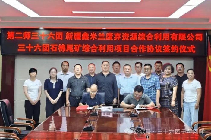 2025年6月18日,三十六團與新疆鑫米蘭廢棄資源綜合利用有限公司舉行了石棉尾礦綜合利用項目簽約儀式。此次簽約的石棉尾礦綜合利用項目計劃總投資達12億元,項目將分兩期同步進行,第一期安裝三條生產線;第二期在三十六團米蘭產業園區內新建鎂、鋁冶煉項目。