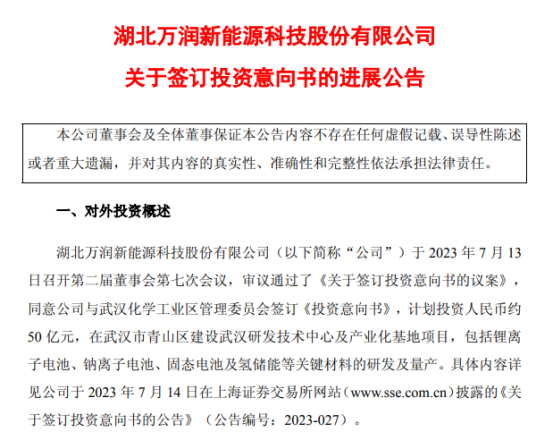 7月14日,萬潤新能發(fā)布公告稱,公司與武漢化學(xué)工業(yè)區(qū)管理委員會(huì)于2023年7月簽訂《投資意向書》,計(jì)劃投資人民幣約50億元,在武漢市青山區(qū)建設(shè)武漢研發(fā)技術(shù)中心及產(chǎn)業(yè)化基地項(xiàng)目,包括鋰離子電池、鈉離子電池、固態(tài)電池及氫儲(chǔ)能等關(guān)鍵材料的研發(fā)及量產(chǎn)。