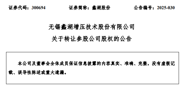 7月16日,無錫蠡湖增壓技術(shù)股份有限公司(簡(jiǎn)稱:蠡湖股份)發(fā)布關(guān)于轉(zhuǎn)讓參股公司股權(quán)的公告,蠡湖股份決定擬將所持高能蠡湖45.45%的股權(quán)(認(rèn)繳出資額1000萬元、實(shí)繳出資額0元)以人民幣0元的價(jià)格轉(zhuǎn)讓給高能時(shí)代。