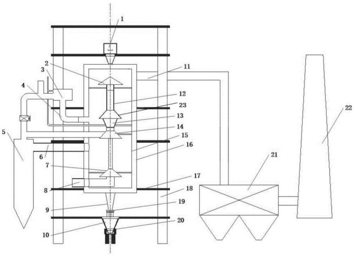這是“一種高效環保的塔式混燃輕燒鎂豎窯及其生產工藝”,在豎窯爐體內外分別設置內燃燒室和外燃燒室,從內外燃燒室產生的高溫煙氣同時從豎窯爐體中心區域和周邊區域與下落的物料進行熱量交換,提高能量利用效率,降低非金屬礦物輕燒產生的環保問題,同時采用塔式結構易于平衡受力,提高爐窯壽命。