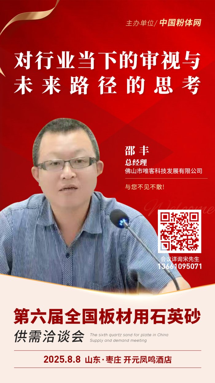 2025年8月8日,由中國粉體網主辦的第六屆全國板材用石英砂供需洽談會即將在山東棗莊召開,佛山市唯客科技發展有限公司總經理邵豐將做《對行業當下的審視與未來路徑的思考》的報告,屆時,他將圍繞該核心議題展開詳細解讀。