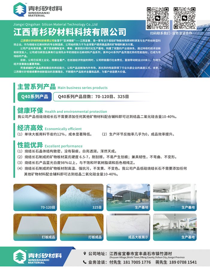 江西青杉矽材料科技有限公司坐落于“亞洲鋰都”——江西宜春,是一家專注于低硅礦物板材用原材料研發與生產的創新型科技企業。作為燒結長石新材料的專業制造商,公司產業布局完善,擁有宜豐、奉新、高安四大現代化生產基地,構建了完整的產業鏈體系。通過持續的技術創新和研發投入,成功研發出具有行業領先水平的燒結長石新材料產品系列。