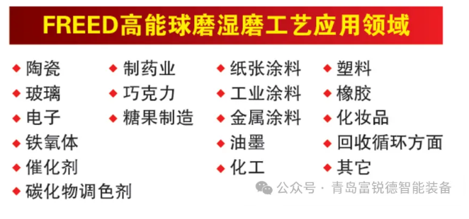 富銳德秉承“合作共贏、銳意進取、以德立信”的經營理念,為中國新材料領域提供具有國際標準的國產化新裝備,高能攪拌球磨已應用于精密陶瓷、碳化鎢、DSM分散強化金屬(機械合金化)、金屬粉末、金屬氧化物、鐵氧體、涂料、油墨、顏料、釉料、玻璃、食品生產、纖維、礦物及化學等領域,高能攪拌球磨已是國內外公認的粉體材料研磨、分散、混料、機械合金化十分有效的設備。