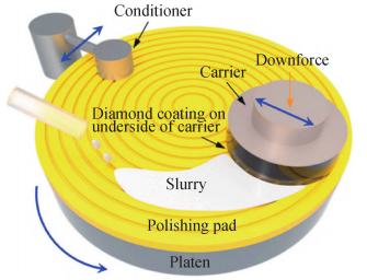 金剛石拋光技術主要有機械拋光、熱化學拋光、激光拋光和化學機械拋光等,其中化學機械拋光(CMP)通過在機械拋光過程中加入氧化劑,氧化碳原子提高拋光速率,是一種利用機械與化學氧化協同作用來實現工件表面平坦化的技術,具有表面損傷小、粗糙度低、設備簡單、運行維護成本低,拋光后的表面污染較輕等優點。