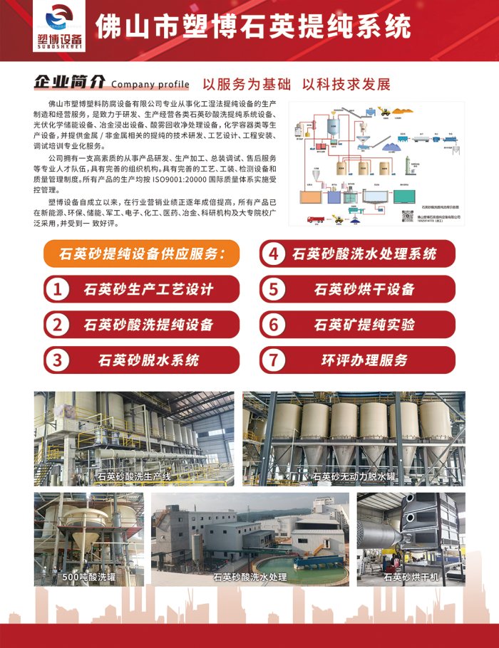 佛山市塑博塑料防腐設備有限公司專業從事化工濕法提純設備的生產制造和經營服務,是致力于研發、生產經營各類石英砂酸洗提純系統設備光伏化學儲能設備、冶金浸出設備、酸霧回收凈處理設備,化學容器類等生產設備,并提供金屬/非金屬相關的提純的技術研發、工藝設計、工程安裝、調試培訓專業化服務。