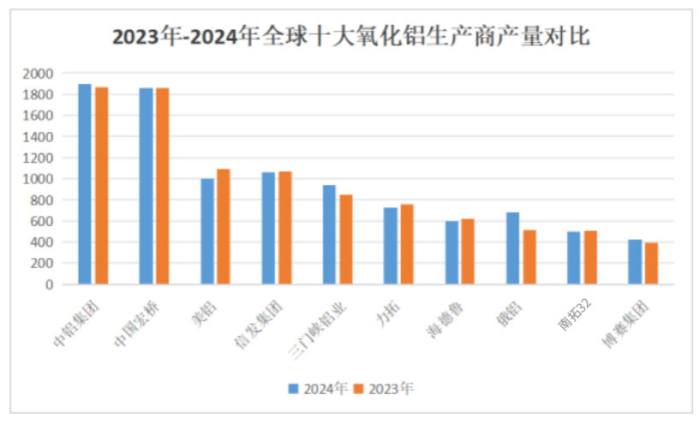 國家統計局數據顯示,2024年中國氧化鋁產量達到8552.2萬噸,同比增長3.9%,占全球總產量的比重高達6成。據阿拉丁相關信息,在全球十大氧化鋁生產商中,中國鋁業、中國宏橋等五家中國企業集團合計產量達6182萬噸,占比高達63.77%。