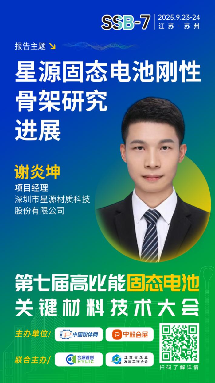 中國粉體網聯合合源鋰創、江蘇省企業發展工程協會,將于2025年9月23-24日在蘇州舉辦第七屆高比能固態電池關鍵材料技術大會。本次大會將聚焦固態電解質、正負極材料、界面工程、智能制造及產業化進展等熱點議題,深入探討固態電池的未來發展趨勢及挑戰。為致力于固態電池技術開發的企業,科研院校,以及新能源汽車、儲能、消費電子等終端企業提供信息交流的平臺,開展產、學、研合作,助推固態電池產業化。屆時,深圳市星源材質科技股份有限公司謝炎坤博士將作題為《星源固態電池剛性骨架研究進展》的報告。