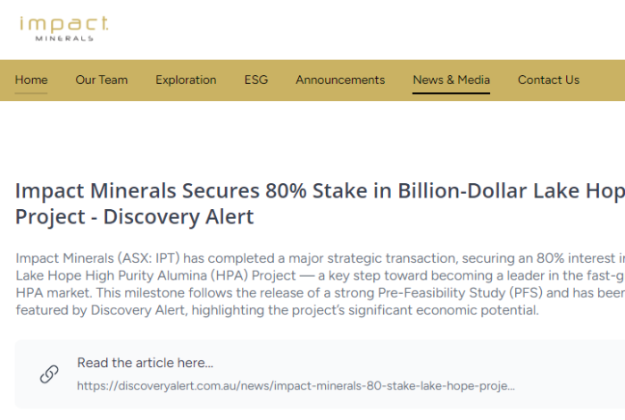 早在2025年4月,Impact Minerals公司宣布將收購另一家企業Alluminous Pty Ltd (Alluminous) 50% 的股權,成為其最大股東。Alluminous是一家新成立的公司, 擁有HiPurA® 高純氧化鋁 (HPA) 加工技術。公司認為,兩起收購項目將形成協同效應。