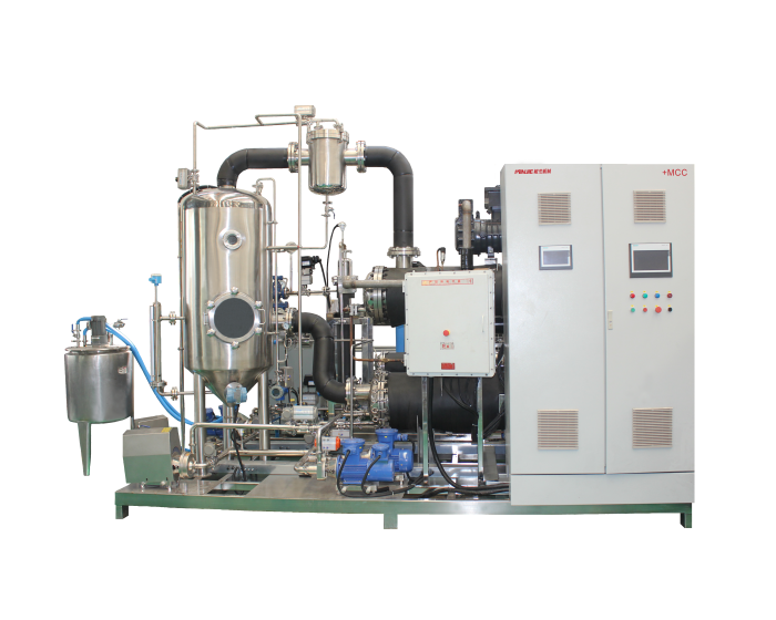 借鑒制冷原理,載能介質在封閉循環系統完成氣態→液態→氣態的不斷循環往復,介質在相態變化過程中實現放熱、吸熱,其中釋放的熱能用于料液升溫蒸發,吸收的熱能來自料液蒸發產生的二次蒸汽的冷凝熱。通過對能源的冷熱雙側利用,實現料液濃縮、溶劑蒸發及溶劑回收。