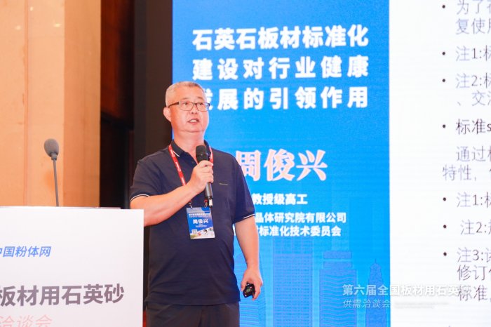 周俊興教授圍繞石英石標準體系展開了系統闡述:首先從基礎概念切入,詳細介紹了標準的定義、分類及作用;接著聚焦具體領域,深入解讀了石英石產品的相關標準規范;在此基礎上,他進一步結合實際場景,精準指出工程應用中石英石產品暴露出的標準執行偏差與質量問題;最后從行業發展視角,深刻闡釋了完善石英石標準的重要意義。