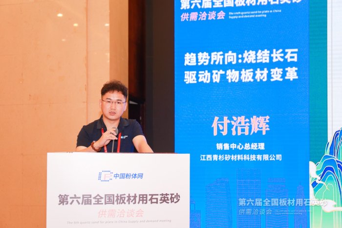 付浩輝總經理首先詳細介紹了江西青杉矽材料科技有限公司的基本情況;接著深入分享了人造板材領域的發展背景與未來趨勢;在此基礎上,重點介紹了公司的核心產品燒結長石Q40;并進一步從環保、經濟、性能等多個關鍵維度,全面且細致地分析了該產品的核心競爭優勢。