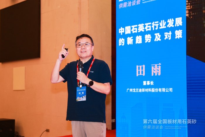 田雨董事長首先闡述了當下環保政策收緊、消費者對臺面安全健康要求提升等因素對石英石生產制造企業的影響。他提出,石英石企業應走差異化發展路徑、提供差異化服務,以避免過度“內卷”和價格惡性競爭。此外,他認石英石的應用領域將越來越廣泛,因此石英石板材廠家要借助AI技術進行品牌推廣和花色創新。最后,他指出當前石英石國際化競爭日益加劇,出口面臨新的挑戰,并針對性地提出了一系列應對策略。