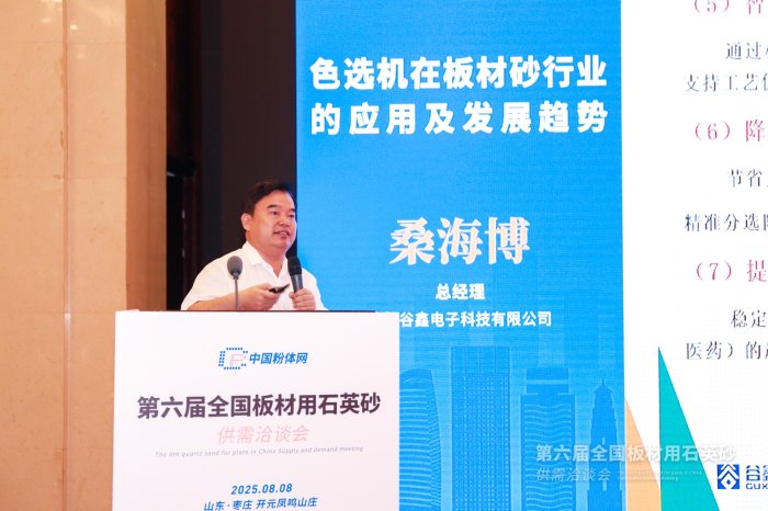 桑海博董事長圍繞色選機在石英石領域的應用與企業發展展開了全面介紹:首先詳細闡述了色選機在石英石行業的具體應用范圍;接著重點分析了色選機在石英礦選礦過程中的核心優勢及完整工藝流程;在此基礎上,系統介紹了合肥谷鑫電子科技有限公司的核心產品、關鍵競爭優勢與完善的售后服務體系,并結合相關實際案例進行了生動分享。