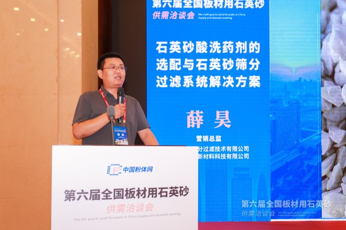 薛昊總監首先從基本概況、合作伙伴及產品應用行業等方面,對河南廣豐篩分過濾技術有限公司作了簡要說明;隨后概述了石英砂酸洗工序中的常見問題,并著重介紹了公司幾款環保清洗劑的性能特點、成本優勢及應用情況;最后還介紹了公司一系列振動篩分用耗材產品。